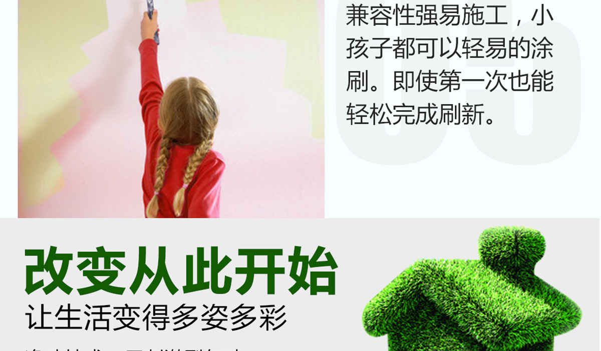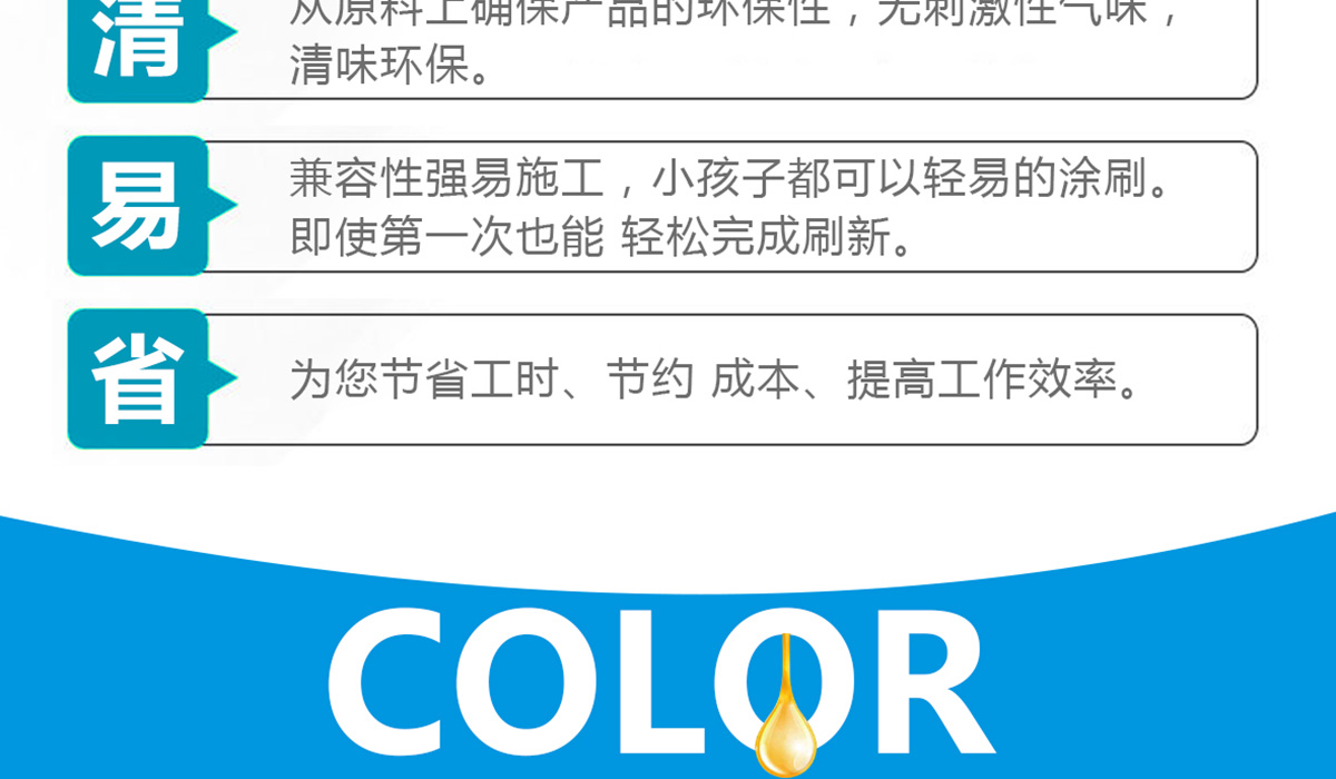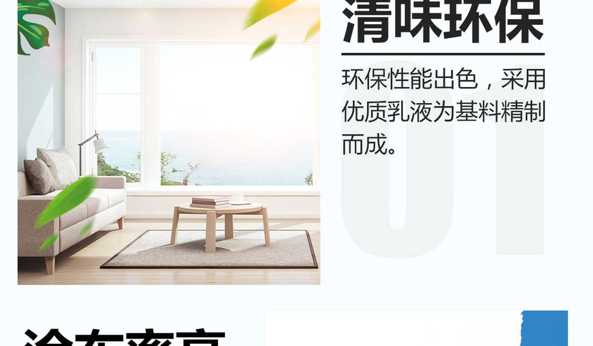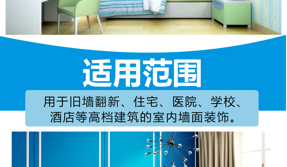 本产品是一款环保性能出色,施工性能优良,涂布率高,遮盖率好,耐擦洗性能好,性价比高的内墙装饰涂料。用于旧墙翻新、住宅、医院、学校、酒店等高档建筑的室内墙面装饰。