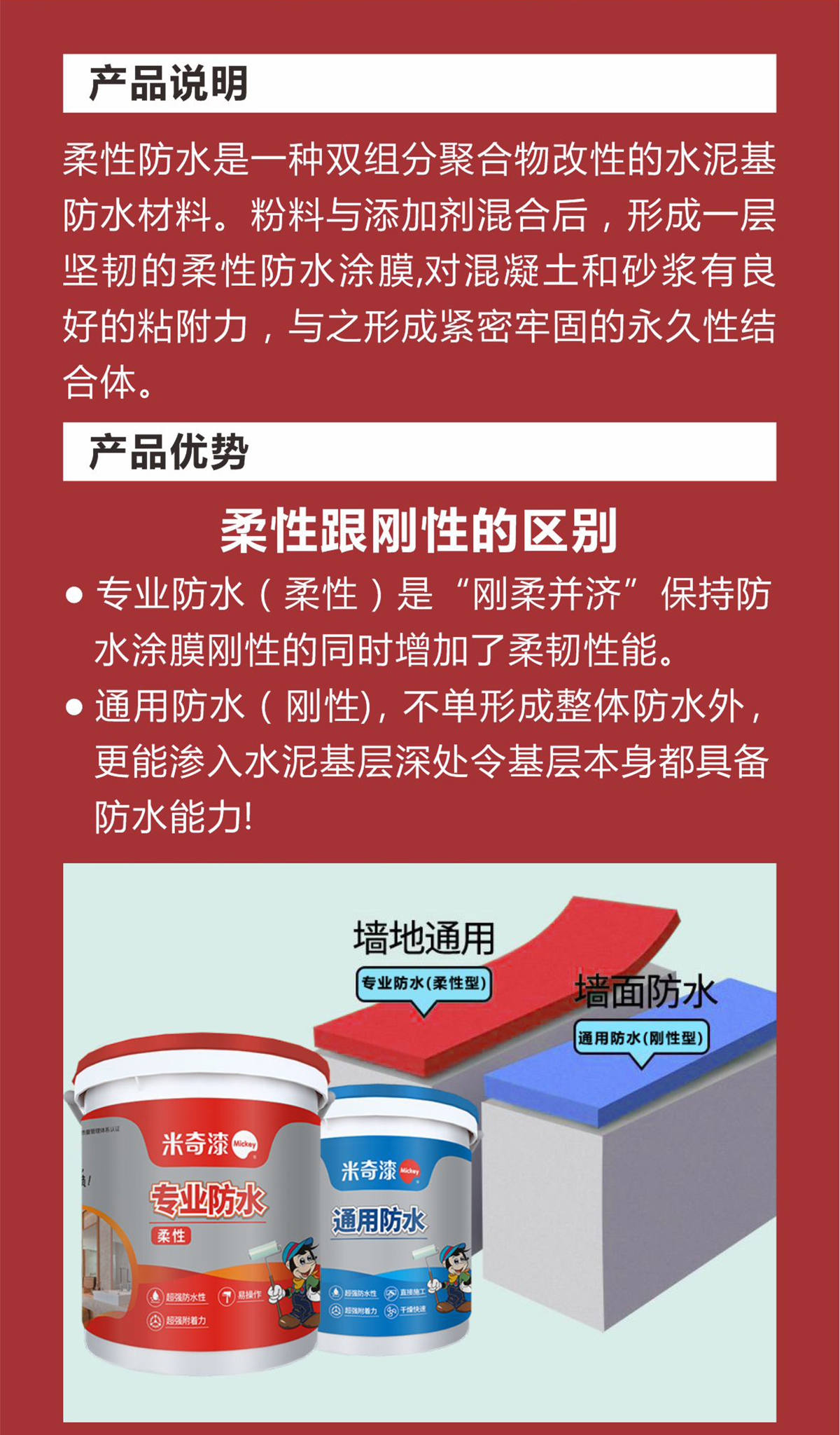 柔性防水是一种双组分聚合物改性的水泥基防水材料。粉料与添加剂混合后,形成一层坚韧