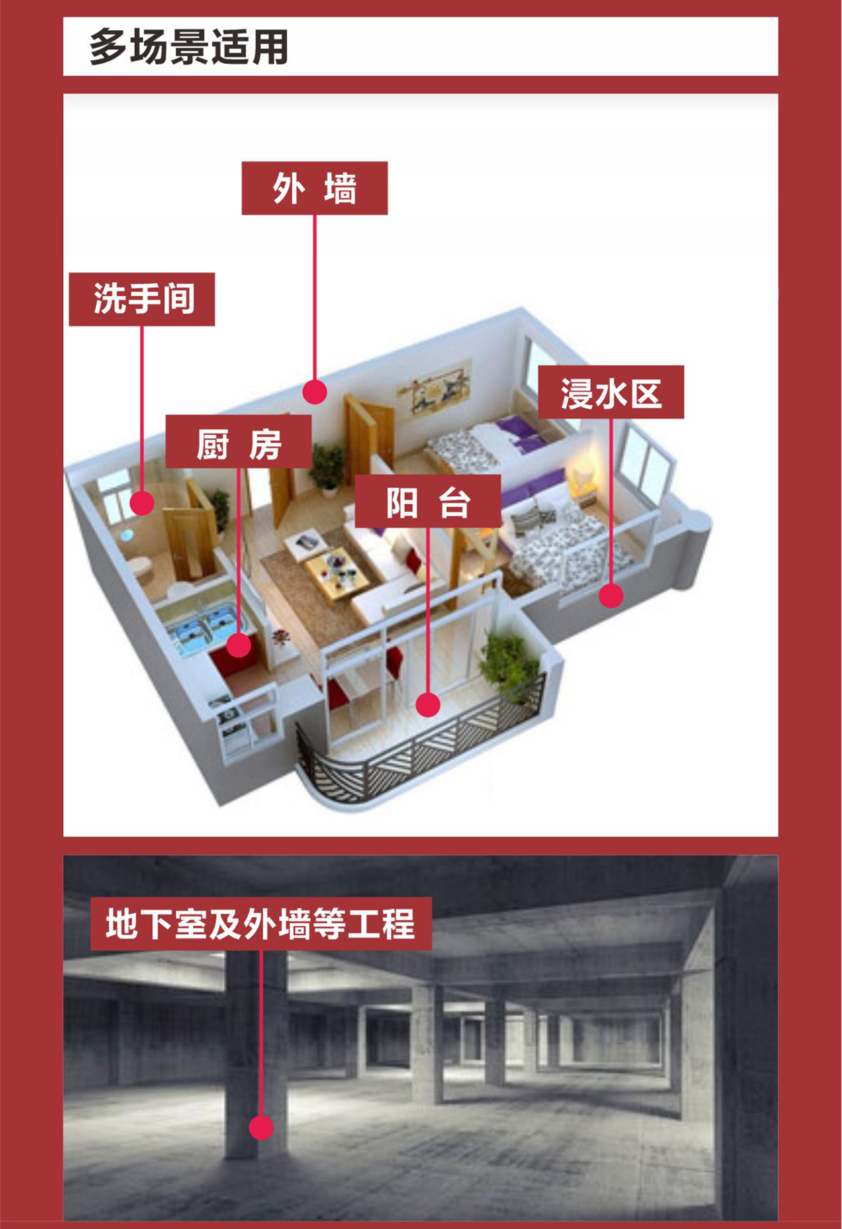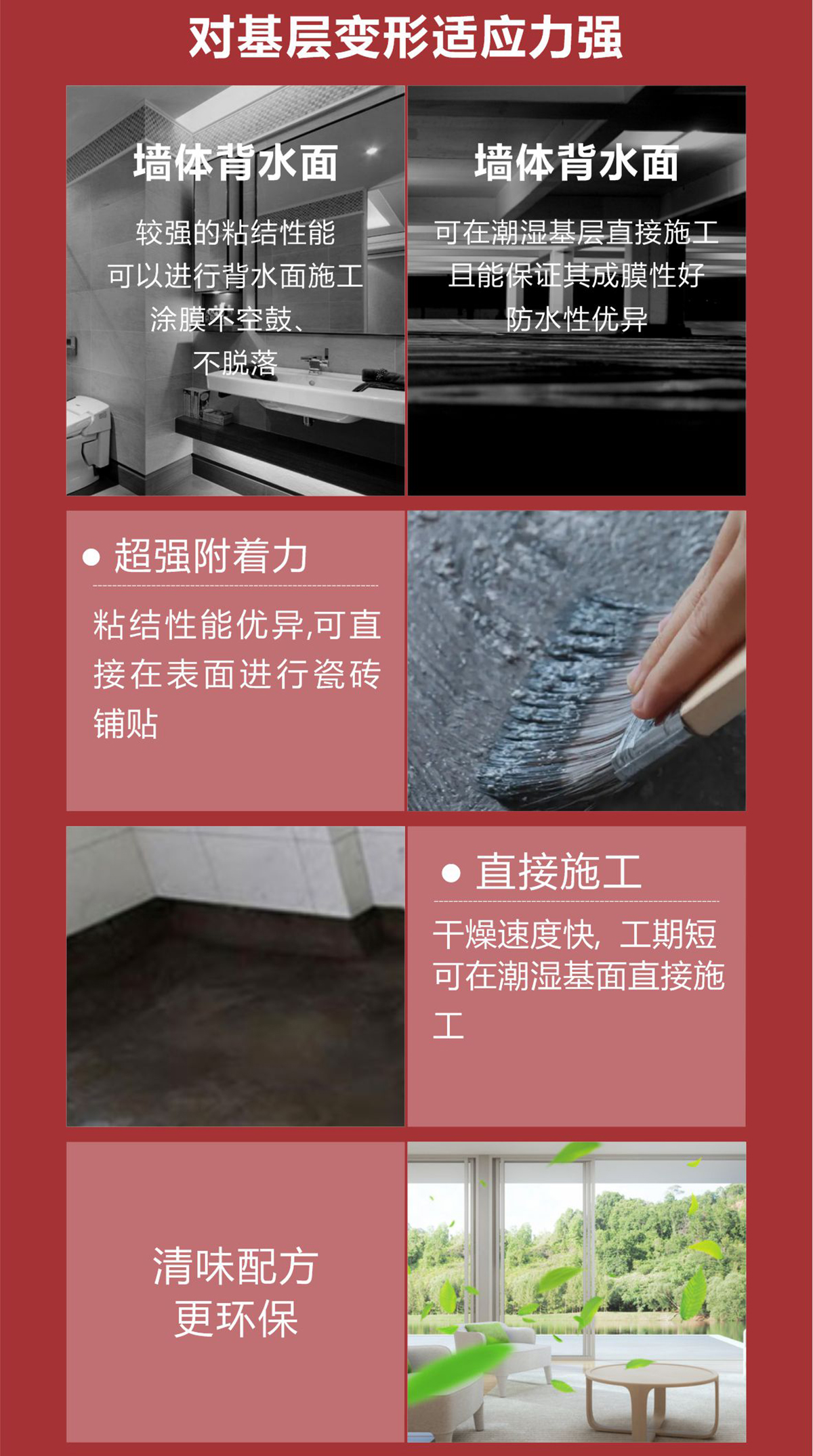 的柔性防水涂膜,对混凝土和砂浆有良好的粘附力,与之形成紧密牢固的永久性结合体。